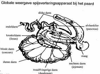 Het spijsverteringskanaal van een paard is uitstekend aangepast aan de opnamen en het verwerken van grote hoeveelheden vezelrijk, energiearm voedsel. Daarvoor heeft een paard een relatief kleine maag (circa 12-14 liter inhoud) en een blinde darm van ongeveer een meter lang (circa 90 liter), waarin het gistingsproces plaatsvindt. In de blinde darm verwerken speciale bacteriën de ruwe celstof of vezels. Het spijsverteringskanaal van een paard is uiterst gevoelig. Er moet altijd voldoende vezelrijk voer worden gevoerd, om de spijsvertering op gang te houden. Het maagdarmstelsel van een paard wordt verdeeld in de dunne darm (die bestaat uit de twaalfvingerige darm, de dunne darm, de leerdarm en de heupdarm) en de dikke darm (die bestaat uit de blindedarm, de grimdarm en de mastdarm die bestaat uit de blinde darm (Caecum), de dikke darm en het rectum) en heeft een totale inhoud van ongeveer tweehonderd liter. De gespierde slokdarm is dun en raakt geregeld verstopt. In dit geval blokkeren voedsel of andere 'brokken' de slokdarm, waardoor de spieren van het paard verkrampen en het paard niet kan slikken. Grotere brokken kun je vaak zien of voelen, bijvoorbeeld wanneer je paard een hele appel heeft doorgeslikt. Een andere oorzaak voor maag- en darmklachten zijn wormen. Deze komen met name voor in het spijsverteringsstelsel. Meestal gaat het hierbij om lintwormen (cestoden), strongiliden of de larven van de paardenhorzel (gasterophilose). Blaasproblemen treden zelden op bij paarden, wel kan je paard last hebben van nierstenen. Dan raakt zijn urinebuis of de blaas verstopt of vernauwd door kleine steentjes. De nier blijft hier meestal van gevrijwaard. Een darmontsteking (enteritis) leidt ertoe dat water en voedingsstoffen niet tegelijkertijd in de darm kunnen worden opgenomen. Darmontstekingen treden vaak op samen met een maagontsteking (gastritis). Een paard kan ook last hebben van een vergroting van de maag, bijvoorbeeld door overvoeding of een darmafsluiting. Ook maagzweren komen geregeld voor. De bekende 'maandagziekte' kan optreden als een paard te weinig beweging en teveel voer krijgt en daarna meteen (intensief) moet bewegen. Dit uit zich in stijfheid van de achterbenen en in ataxie (bewegingsstoringen)